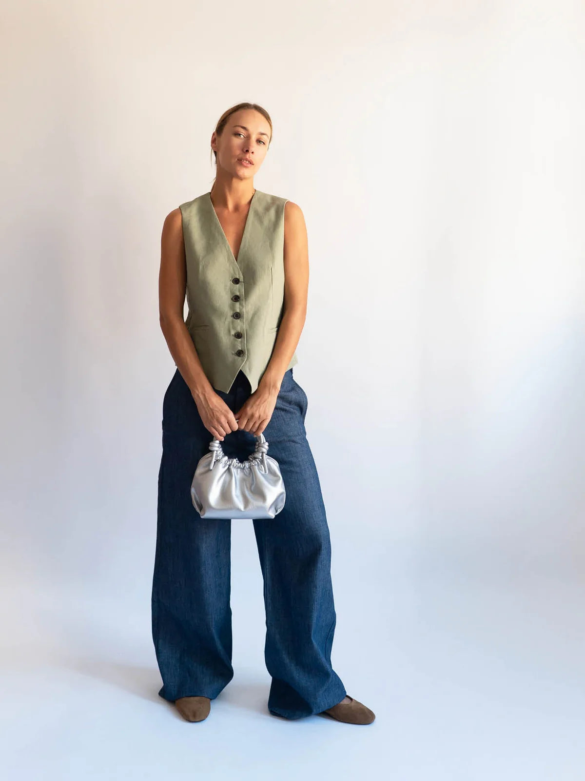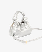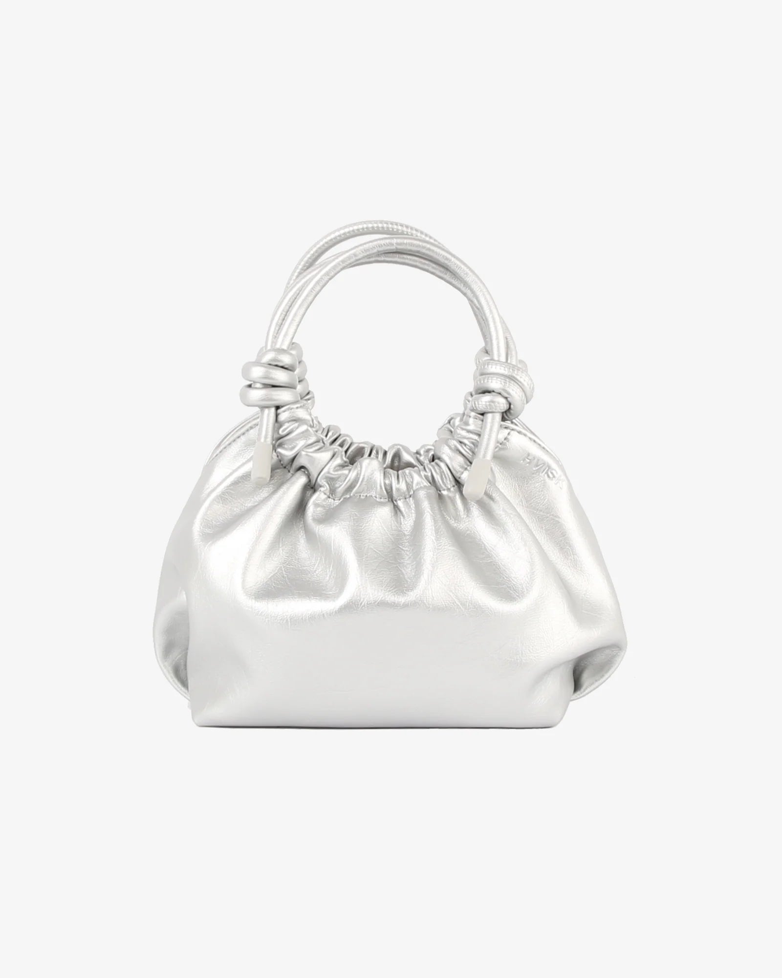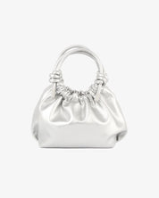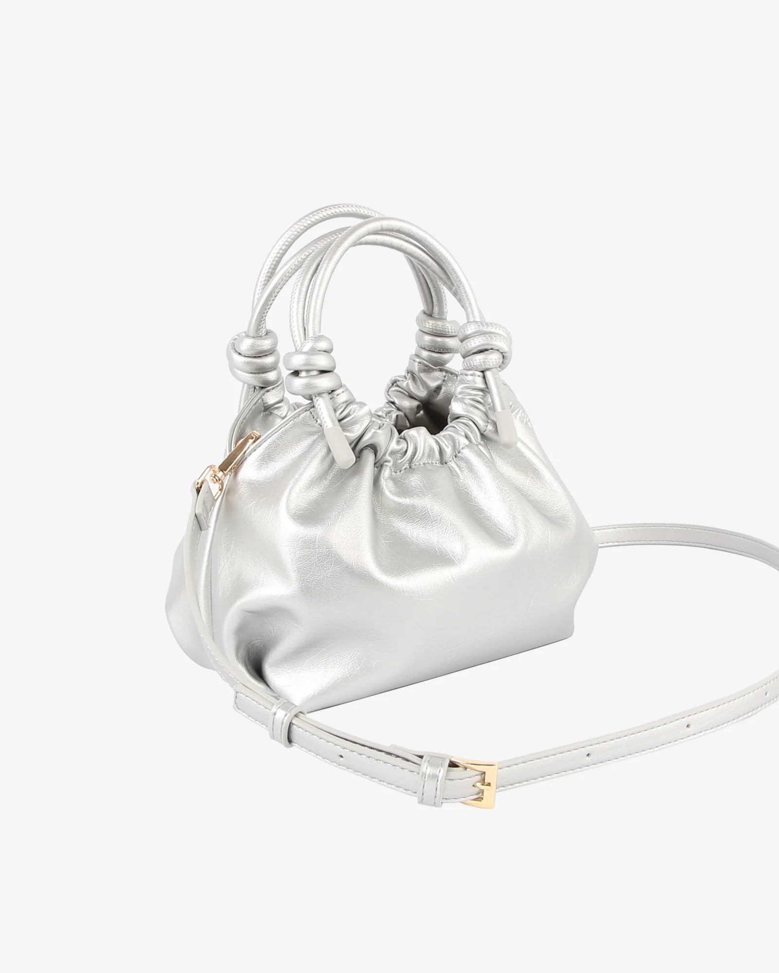 Mini handle bag with magnetic closure and knotted detailing on the handles. The bag has one compartment with one zipper-closed inner pocket.