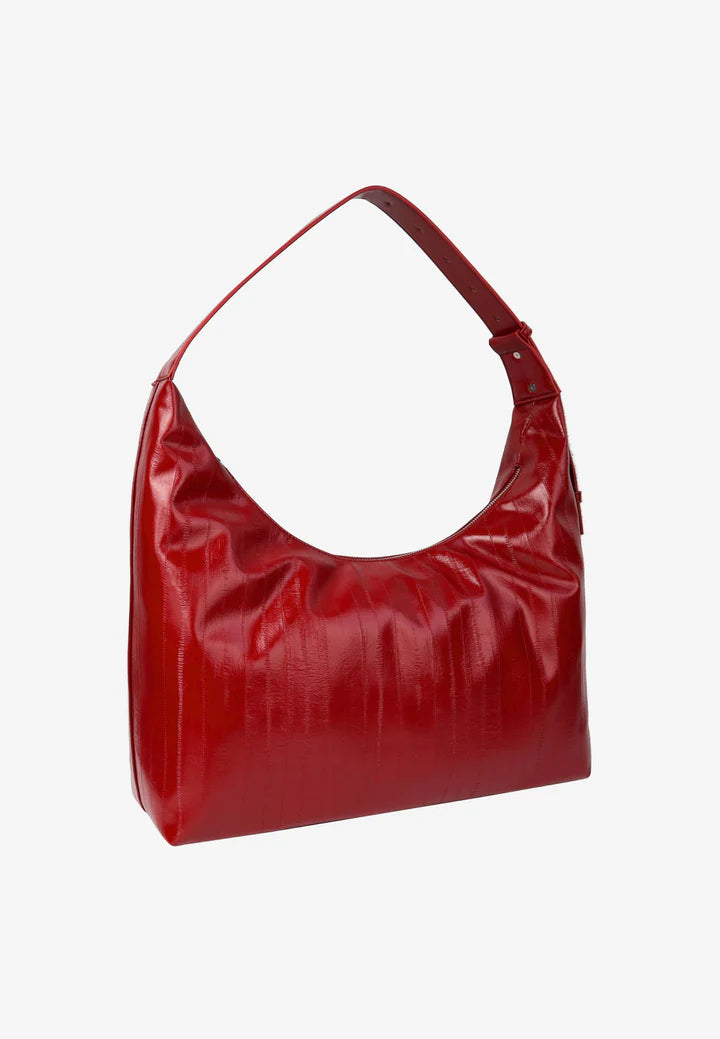 Shoulder bag with adjustable strap and zip closure. The bag contains one compartment with two inner pockets and one inner zip pocket.