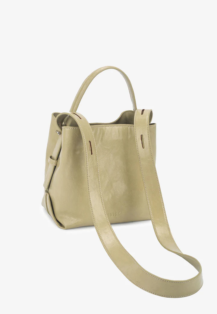 Bucket bag with one main compartment and one inner zip compartment placed in the middle as a divider. The bag comes with an adjustable crossbody strap.