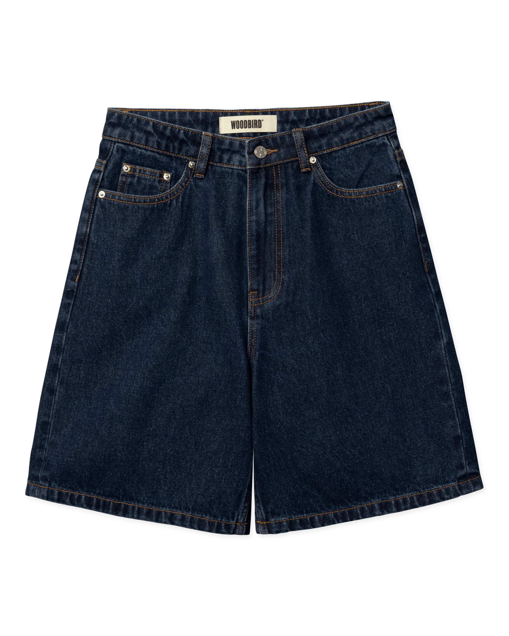 Features button and zip fly closure, classic 5-pocket design, subtle seam detail, and back patch with woodbird logo.