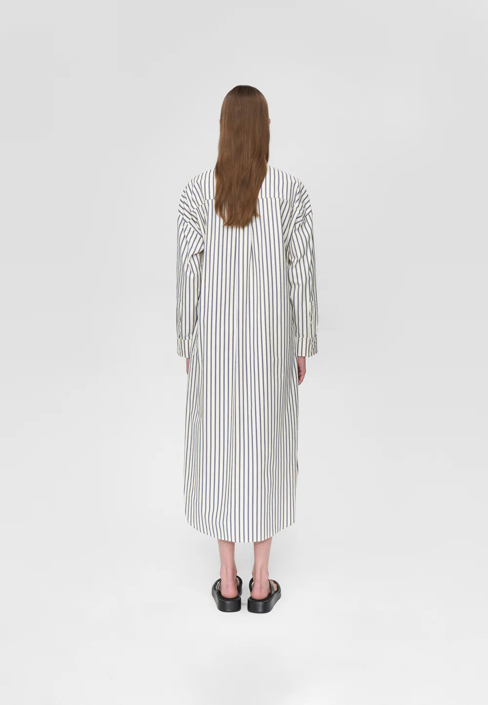 Loose fit shirt dress in a classic striped cotton mix quality. Waist adjustment detail adds a feminine and modern touch to a classic wardrobe essential.