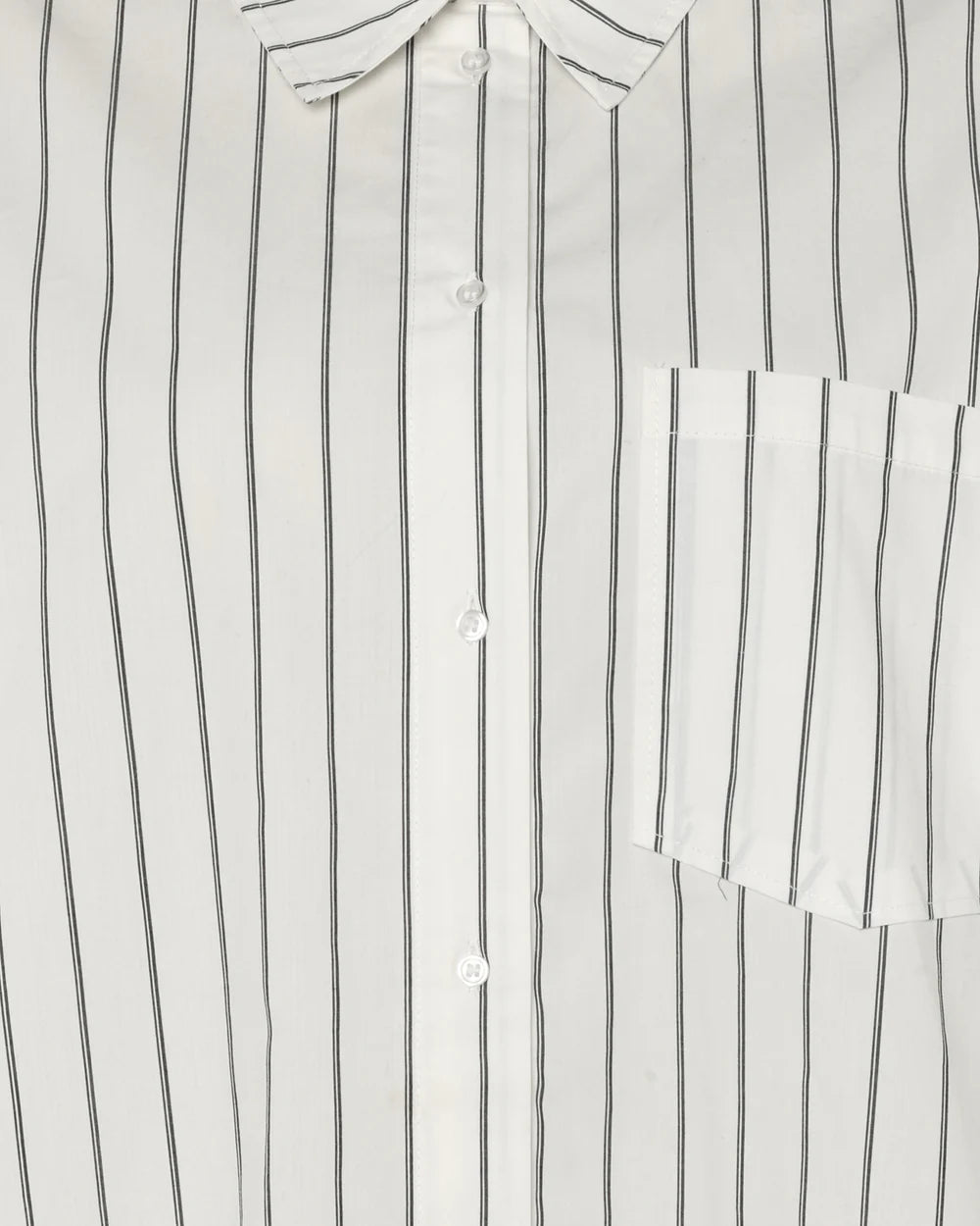The Faber Shirt features a sophisticated pinstripe design with slender black lines set against a crisp white background, creating a timeless look. Crafted from 100% organic cotton, this long shirt extends to mid-thigh for versatile styling options. Its classic collar and button-down front offer refined detailing while ensuring comfort and breathability throughout the day. Ideal for layering or wearing alone, the Faber Shirt combines sustainable materials with expert tailoring to elevate your wardrobe with understated elegance.
