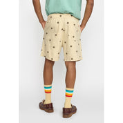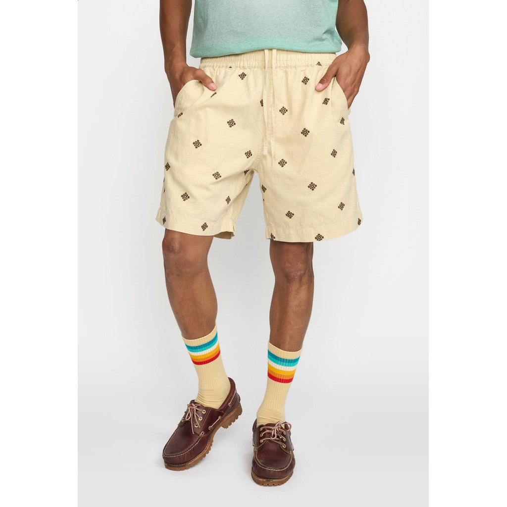 These embroidered shorts are crafted in a mid-weight linen-cotton fabric mix and has a nice surface structure. Linen is a fiber of the flax plant, and it has multiple benefits - it is a very strong and durable, highly absorbent, breathable and has temperature-regulating properties. The shorts are detailed with all-over embroidery featuring a characteristic geometric pattern. They come with a fully elasticated waistband to deliver ultimate comfort. A single back pocket with a ‘Revolution’ brand-label adds character to the backside of the shorts, and the two slanted side-pockets provides functional convenience. The adjustable cord inside the waistband, ensures a perfect fit for different body-types.