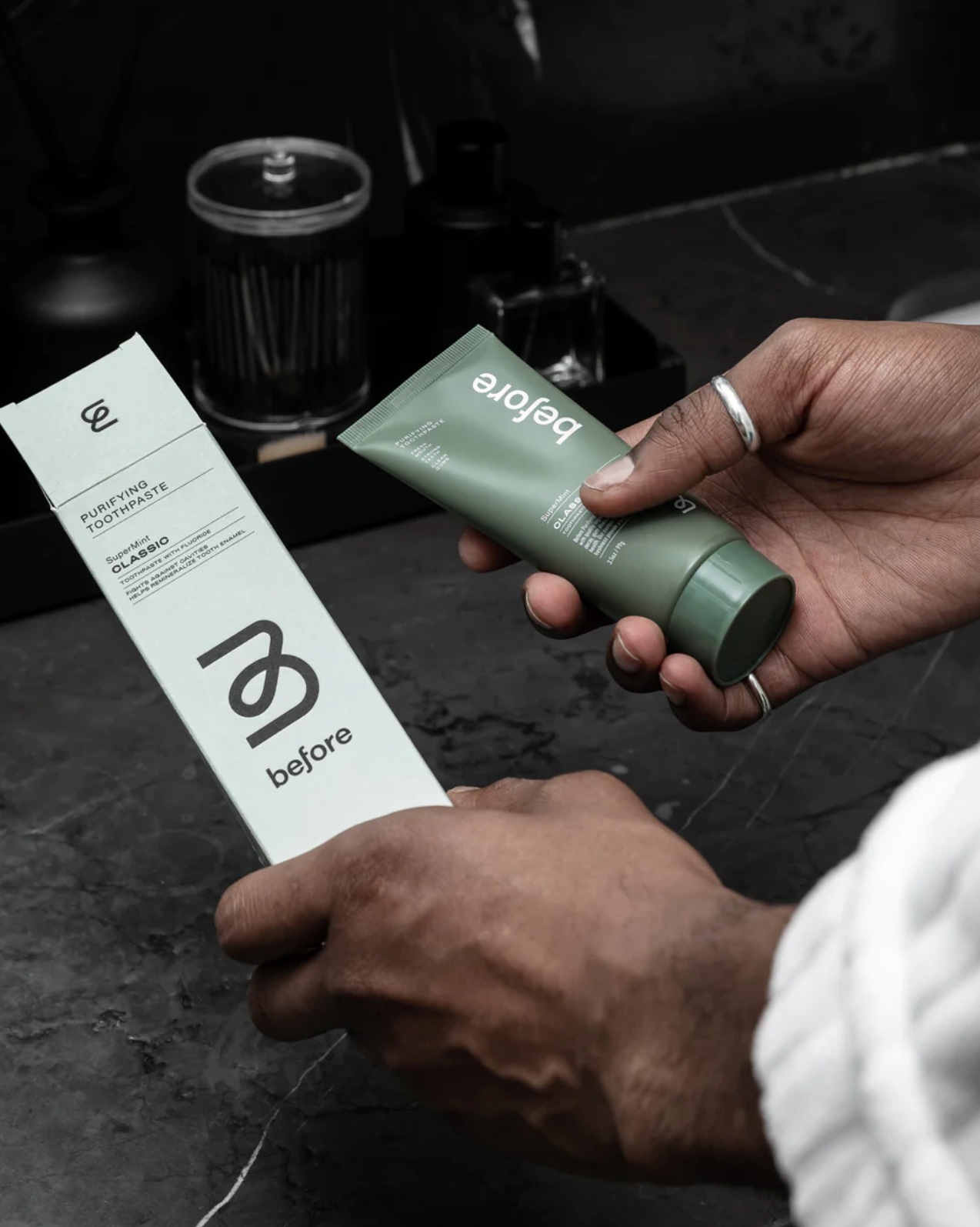 Your number one award winning go-to cavity defence. Before’s natural Purifying Classic Toothpaste goes to battle against tooth degradation with our custom blend of high-quality ingredients and sodium fluoride. Upgrade your brushing routine with our perfectly balanced foaming, soothing Supermint flavour and silky low-abrasion texture. Fight cavities, remineralize your tooth enamel, and level up your mouth health without harmful chemicals and synthetic ingredients.