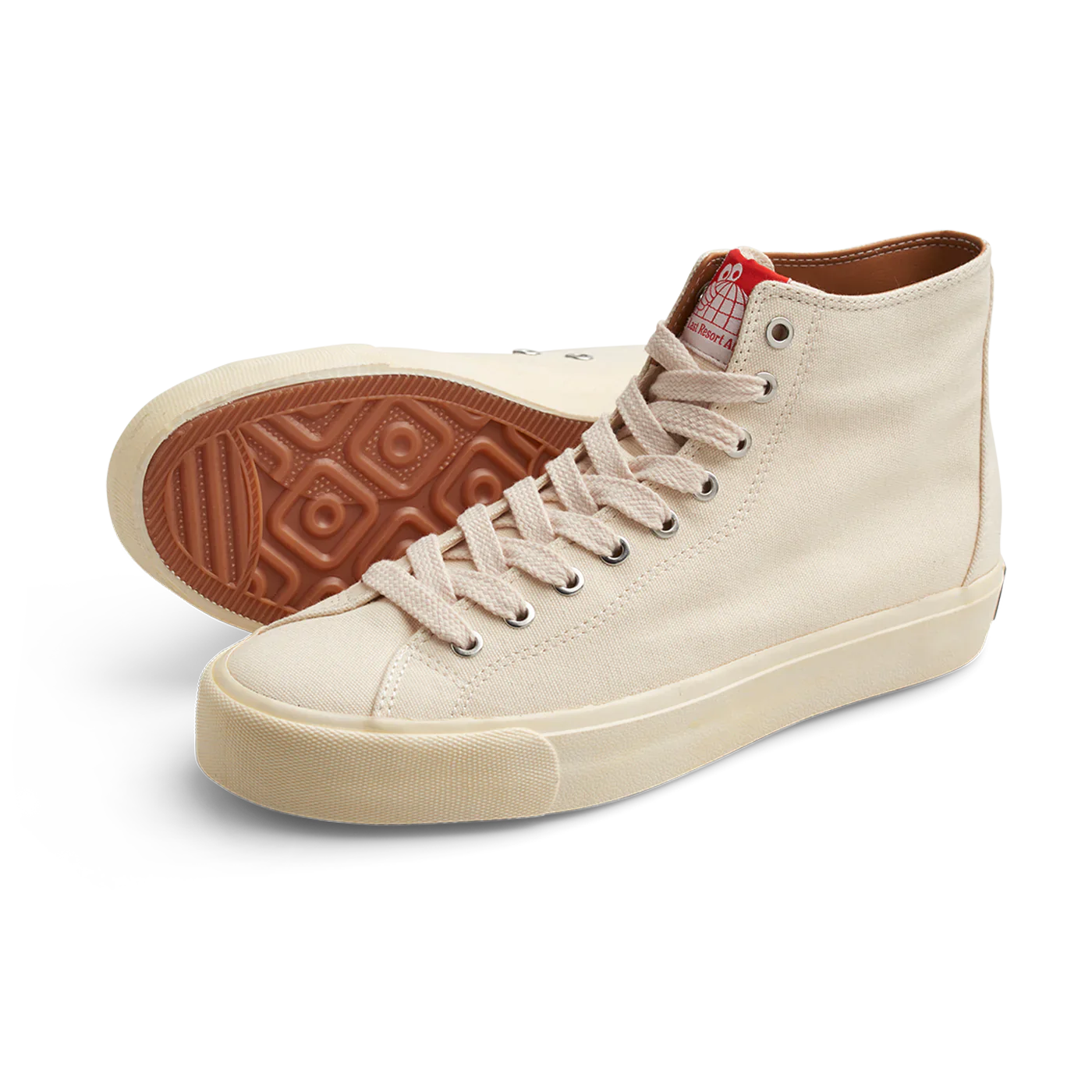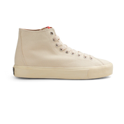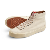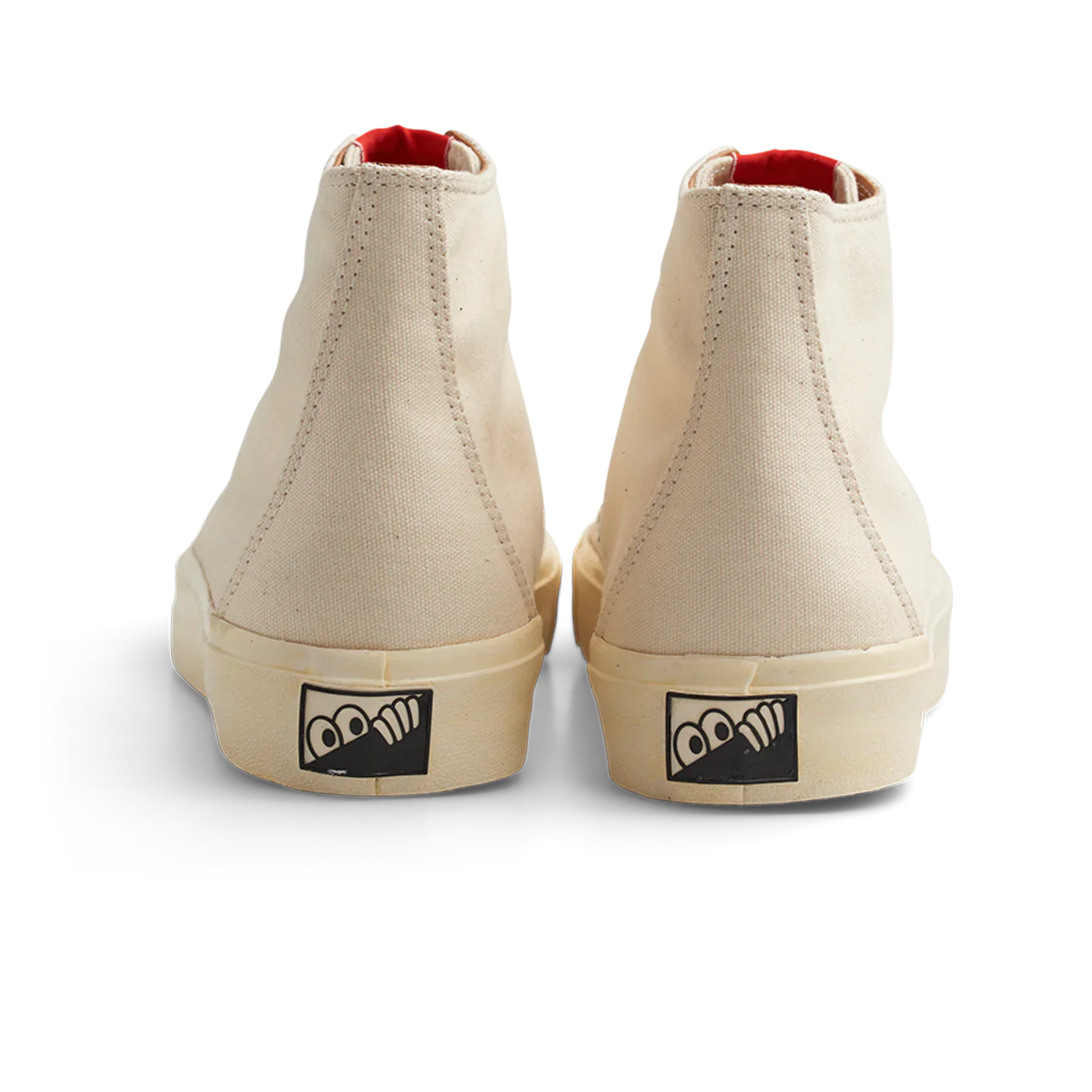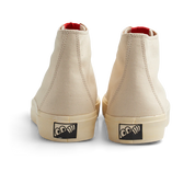 VM003-Hi Canvas White/White is a casual un-padded silhouette, and it also has the hidden rubber reinforcements between the upper and lining. 100% Vegan friendly.