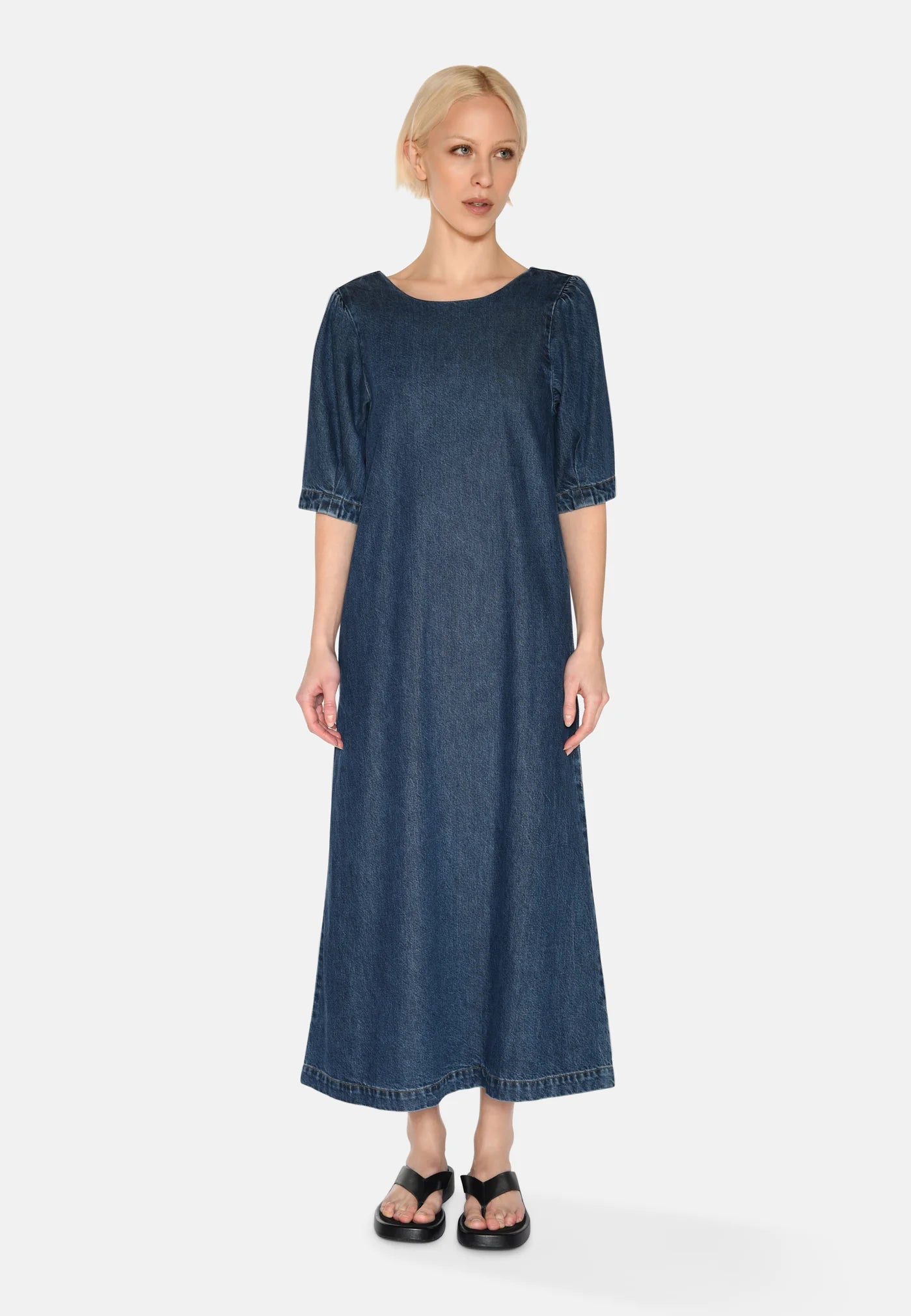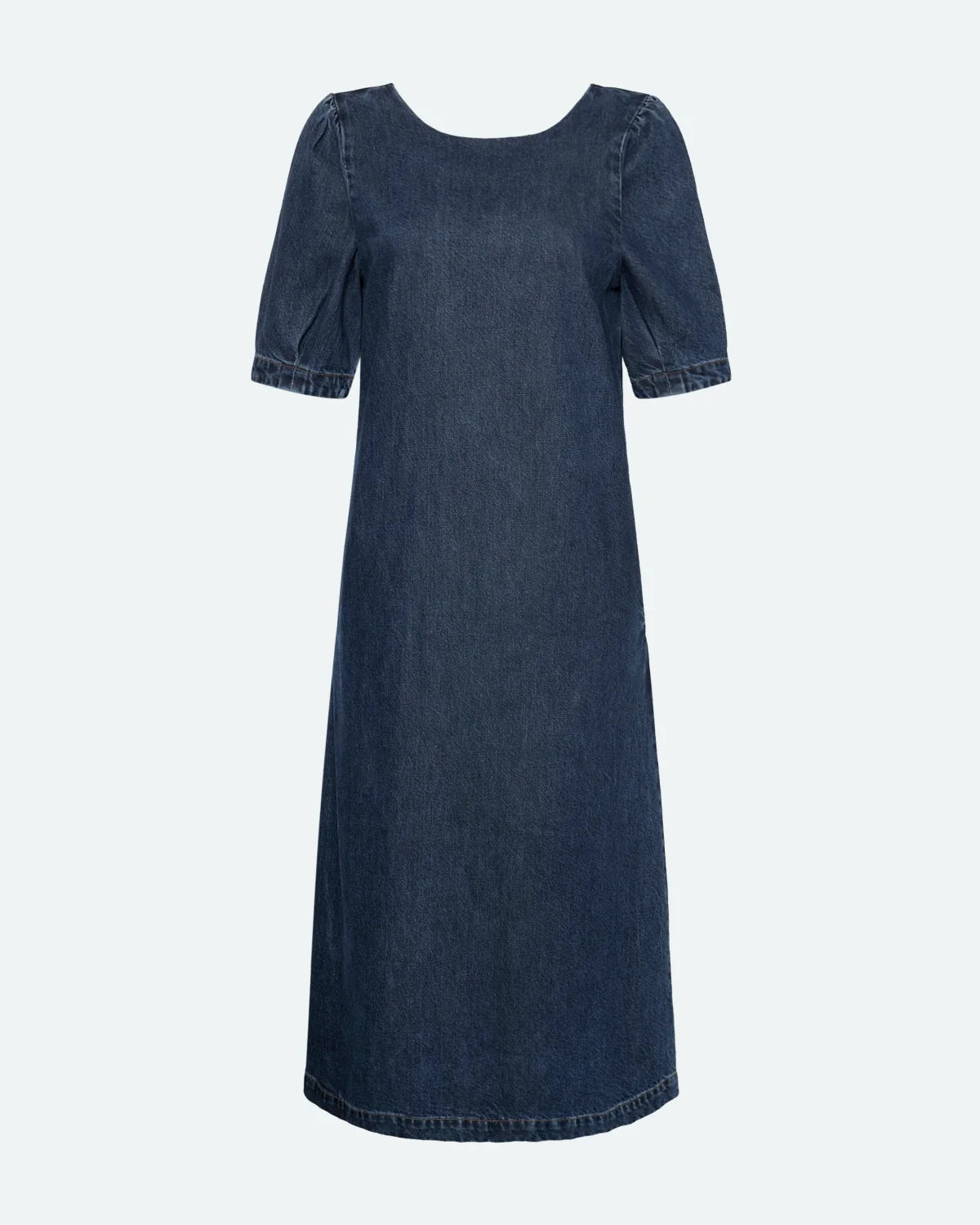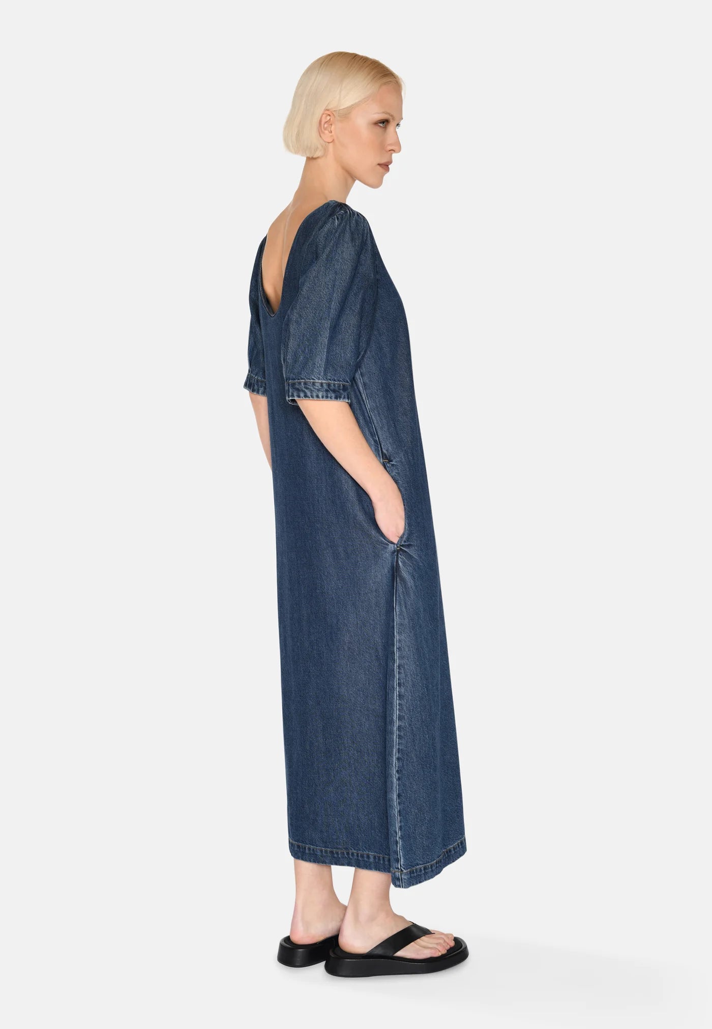 The dress is detailed with short sleeves that give a light and casual look, as well as two practical side pockets that add both functionality and a casual touch. The deep neckline in the back gives the dress a modern and feminine element that creates a flattering and eye-catching look.