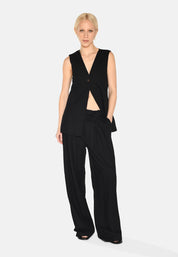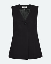 Designed with a classic v-neck front and a single button closure, the vest creates a clean and sophisticated look. The fitted silhouette accentuates the waist and makes it perfect for layering over a shirt or on its own for a bolder look.