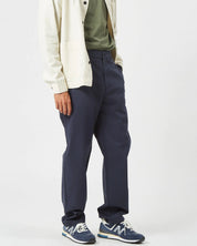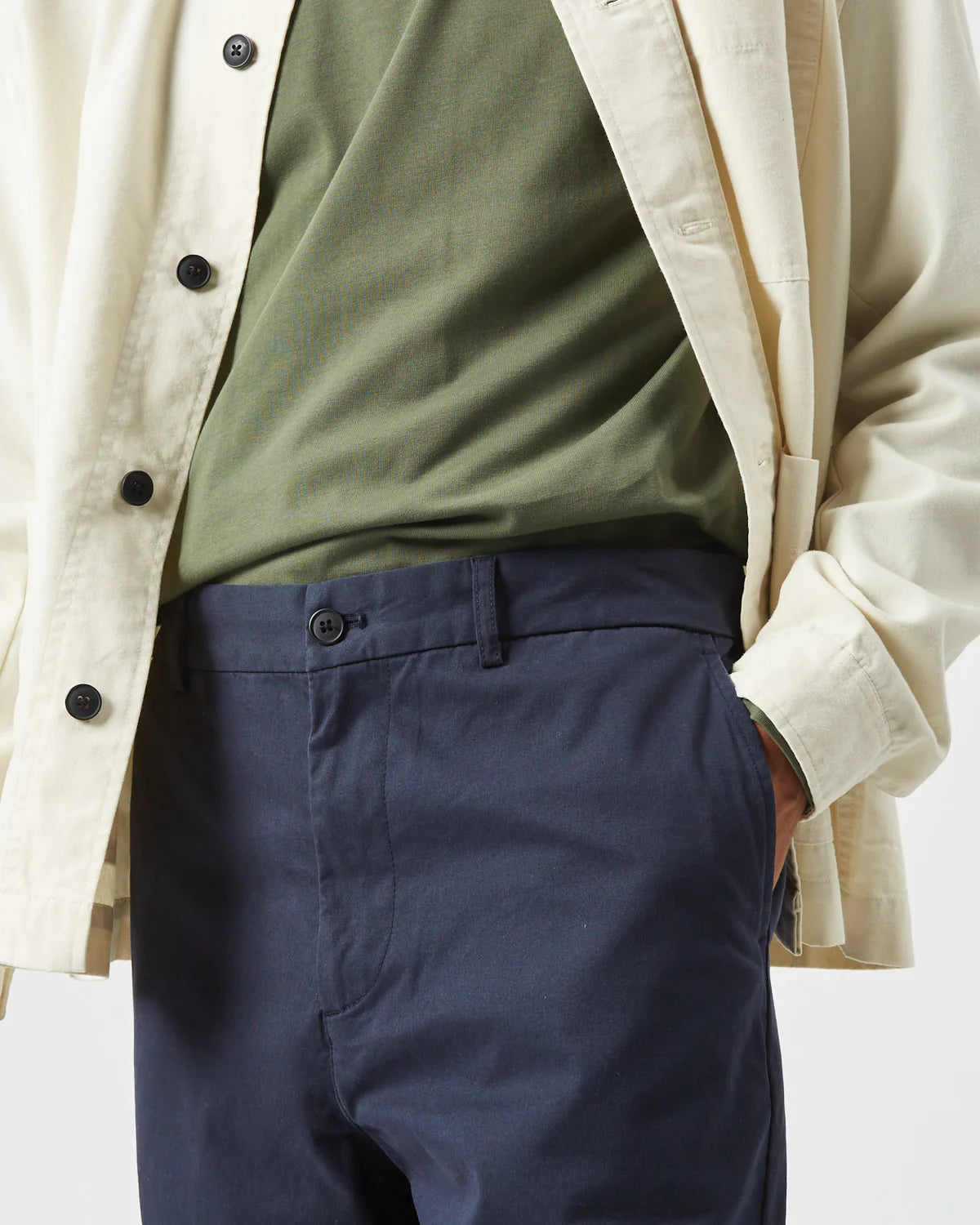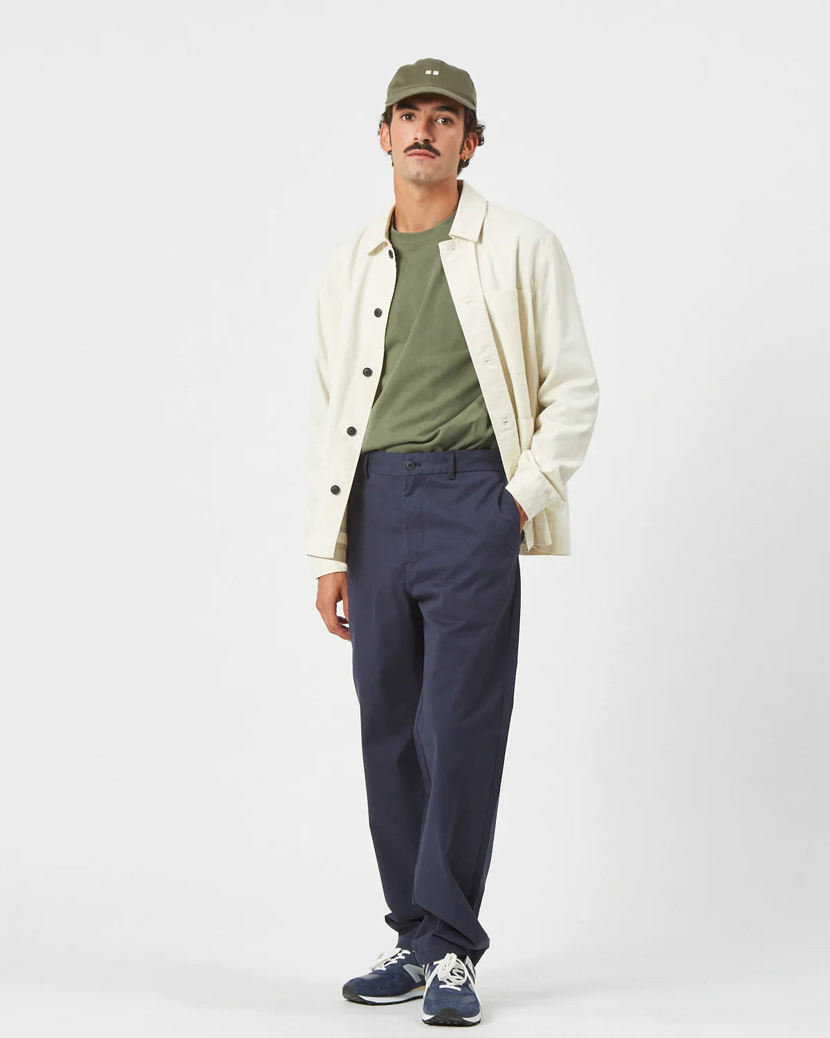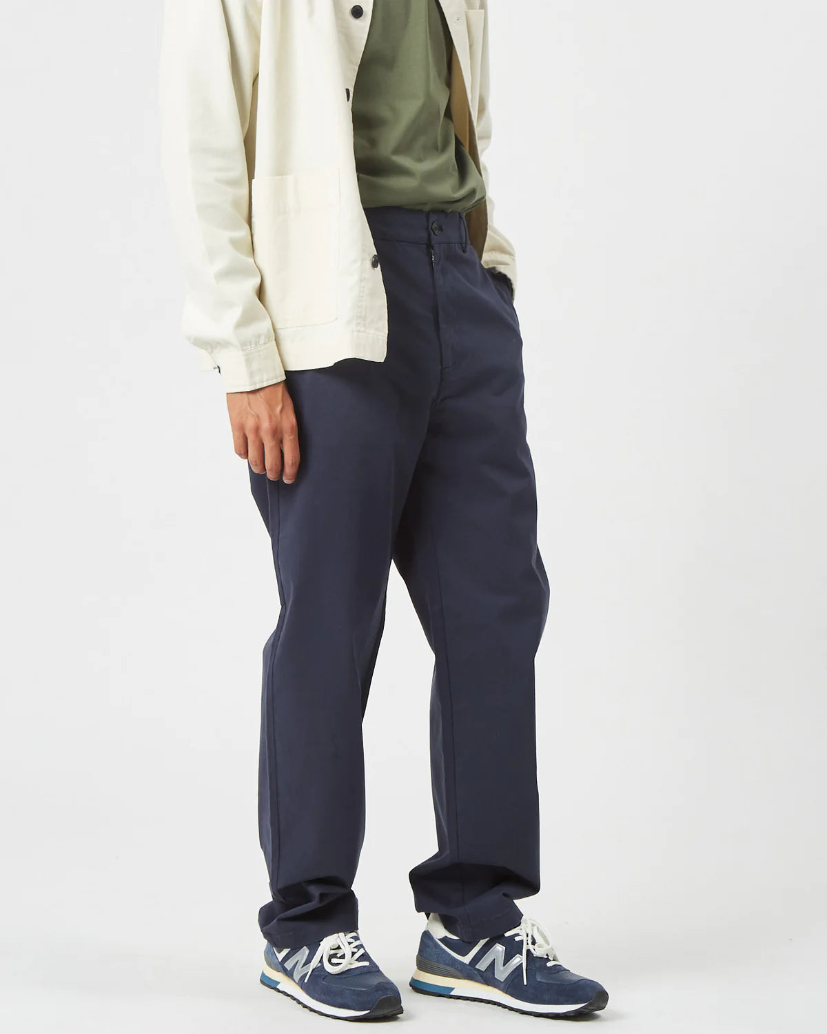 A pair of pants crafted from organic cotton and elastane for a comfortable and stretchy quality. The pants have a loose fit with straight legs. They feature button and zipper closure, belt straps, slanted side pockets and welt pockets at the back.