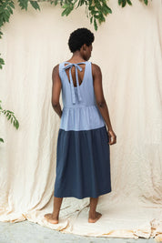 The Noelle dress is a sleeveless, tiered midi dress, with a loose cut A-line body. It features a low scoop back, with a tie to the back neck, and side pockets at the hip.