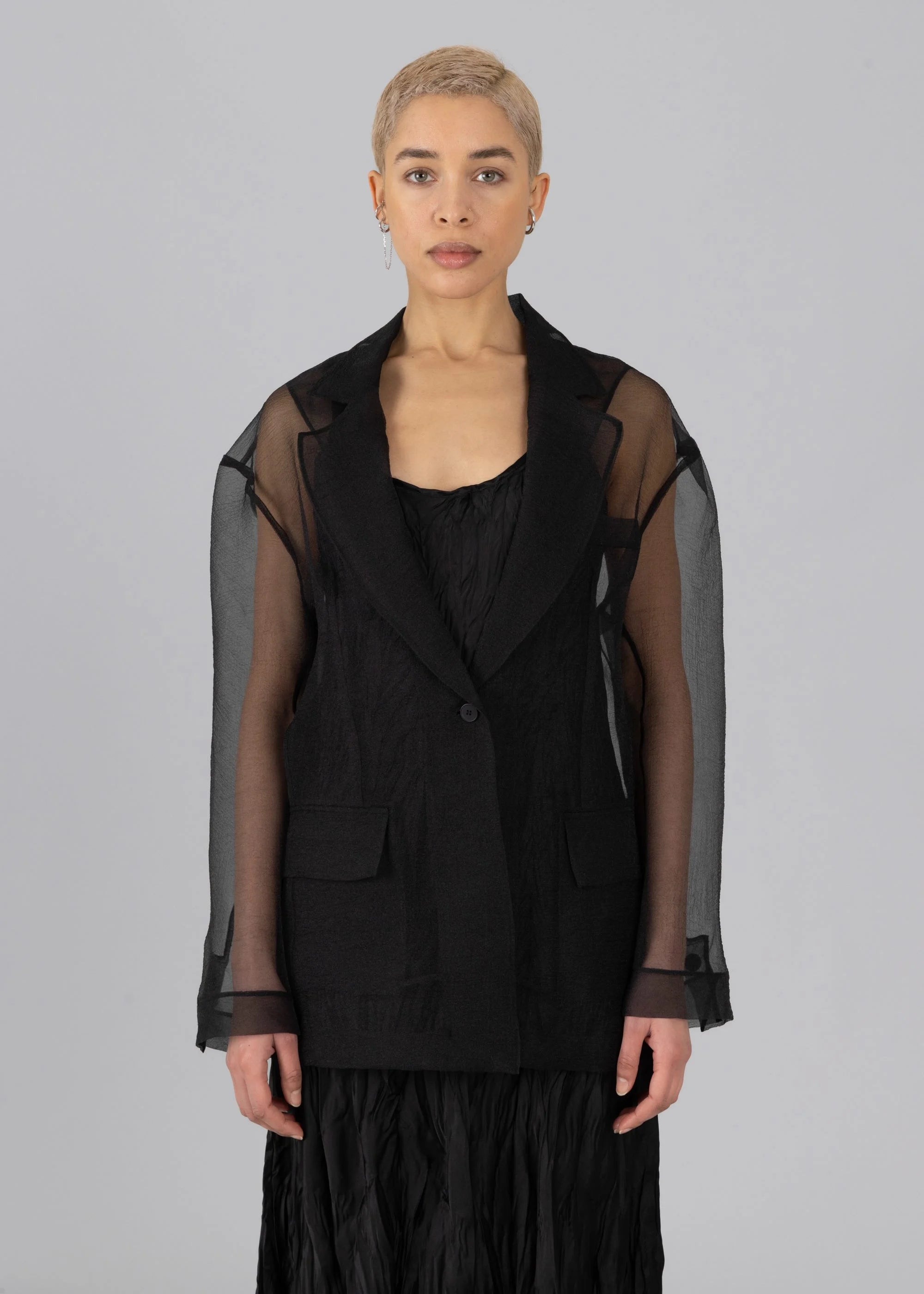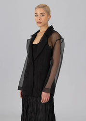Experience understated elegance in this lightweight, non-stretch black top. Designed with a relaxed fit, this piece features a notch lapel, long sleeves, and a single button fastening at the front. The top is further enriched with patch pockets and a welt pocket at the bust to add a functional touch. Responsibly sourced and sustainable, this top is an embodiment of ethical fashion. Enjoy a subtle hint of style with buttons at the cuffs. Think semi-sheer sophistication for your everyday wear.