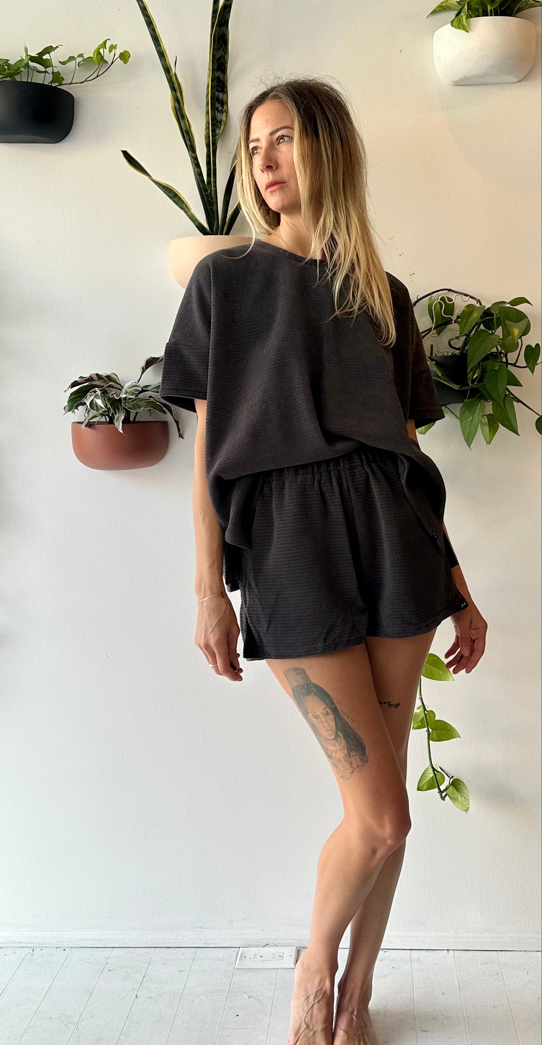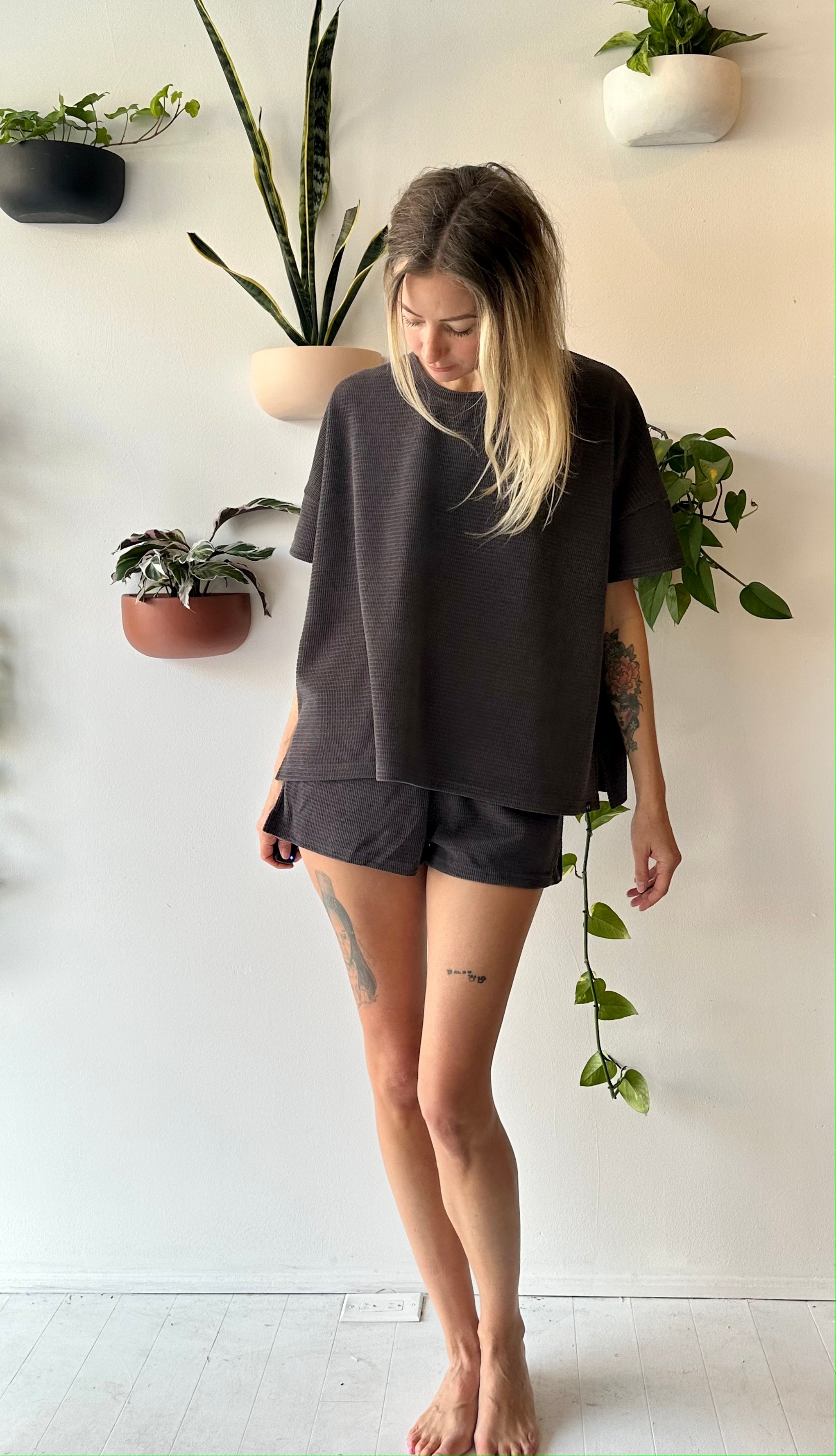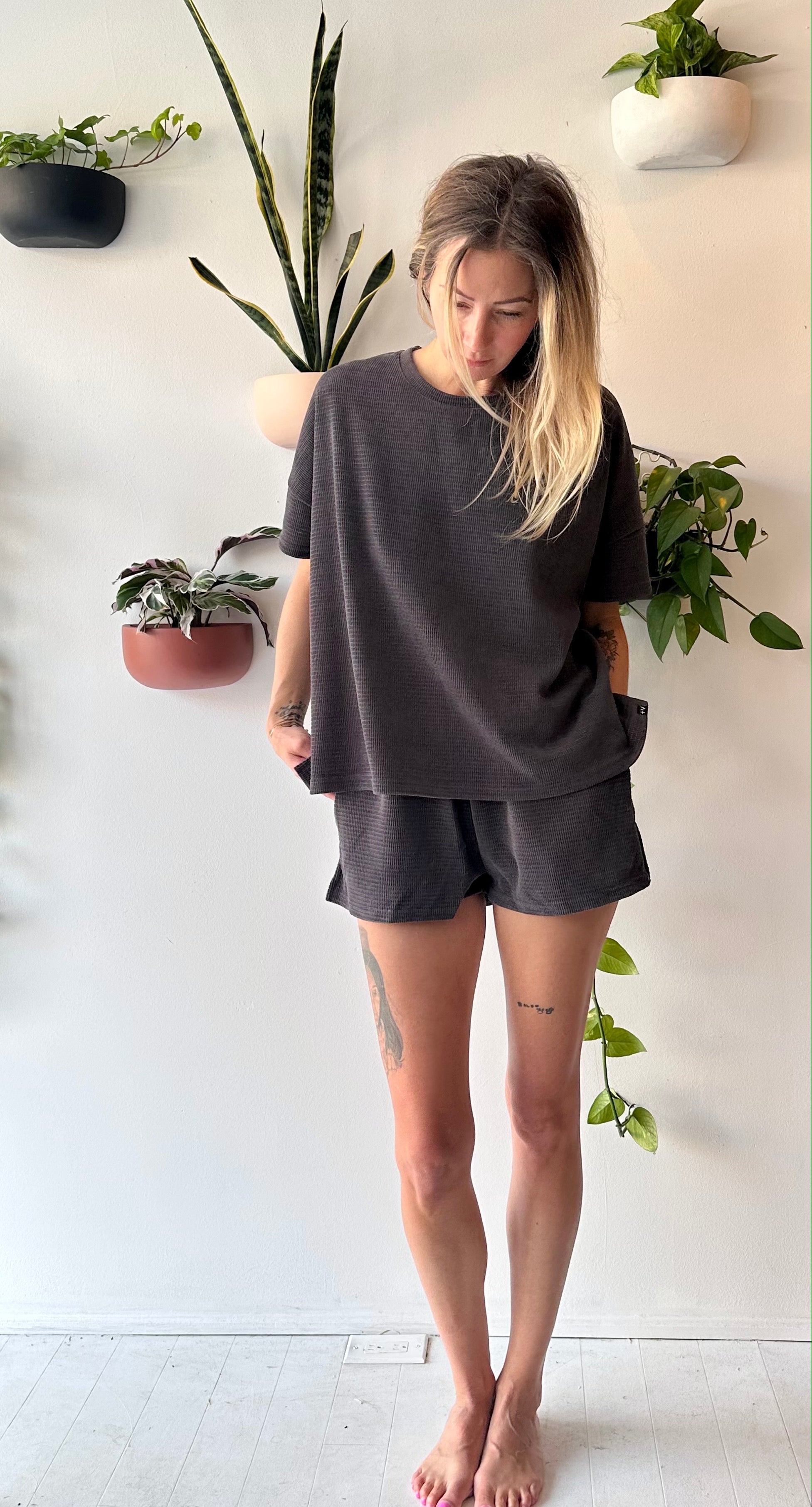 we took your favourite summer '22 terry set and turned it into a waffle dream!!  oversized boxy short sleeve tee in a rich waffle fabric.