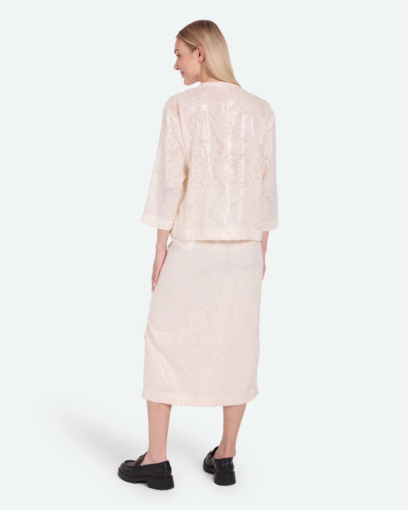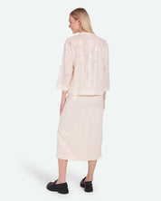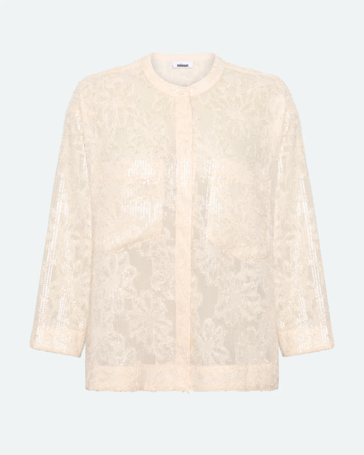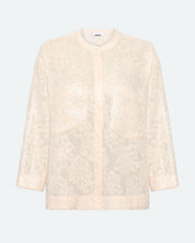 Veronicas is festive shirt with sequins made of 100% polyester for a light quality. The shirt has a loose fit and is designed with three quarter sleeves, two front pockets and a mandarin collar with button closure.